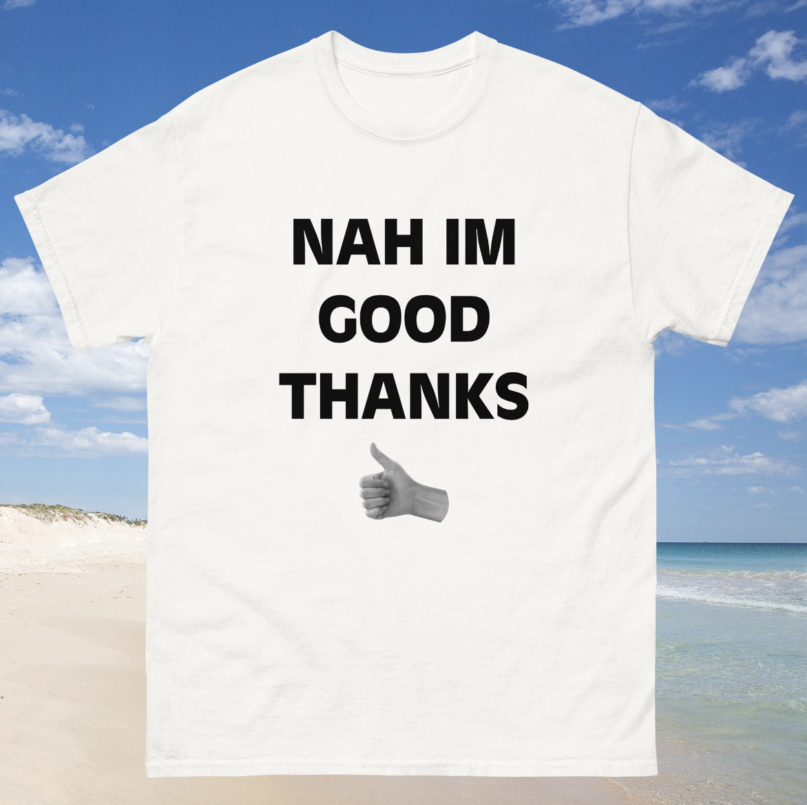 Now you get to own one that says NAH IM GOOD THANKS !
